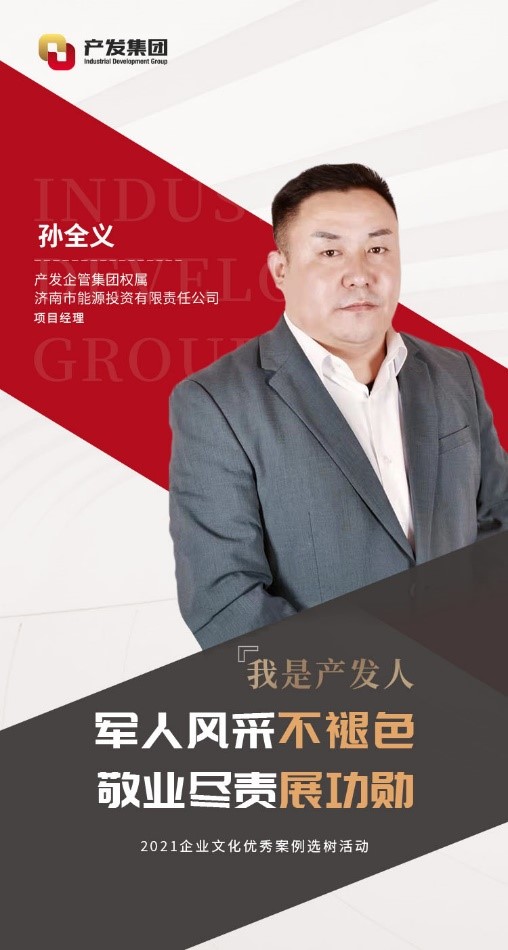 孙全义,现任产发企管集团权属济南市能源投资有限责任公司(以下简称“能投公司”)项目经理。2001年参军,在部队期间刻苦训练,听党指挥,服从命令。2003年他从部队光荣退役,随后加入能投公司。期间曾借调至济南市发改委帮助工作,现负责能投公司的资产管理工作。